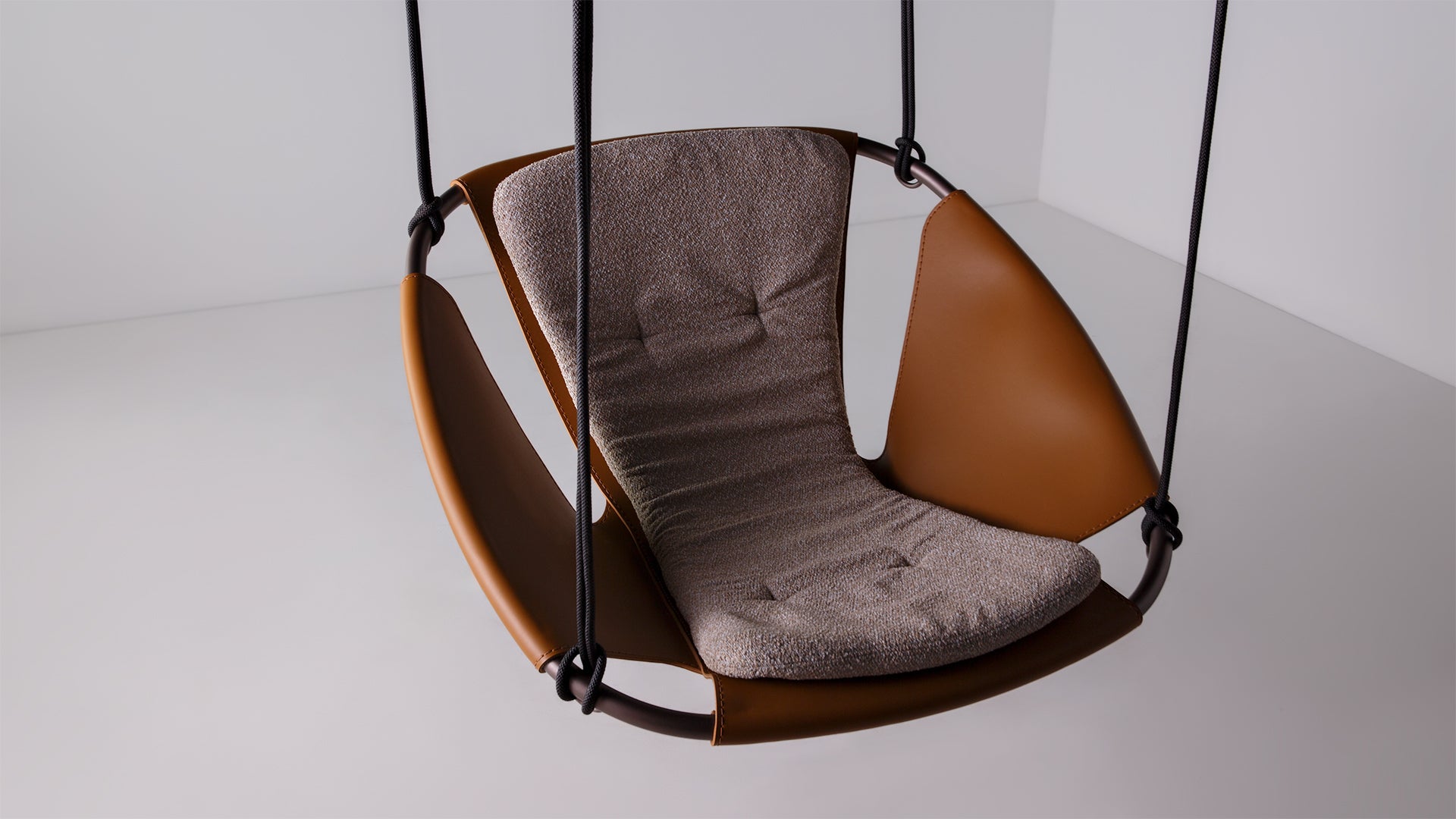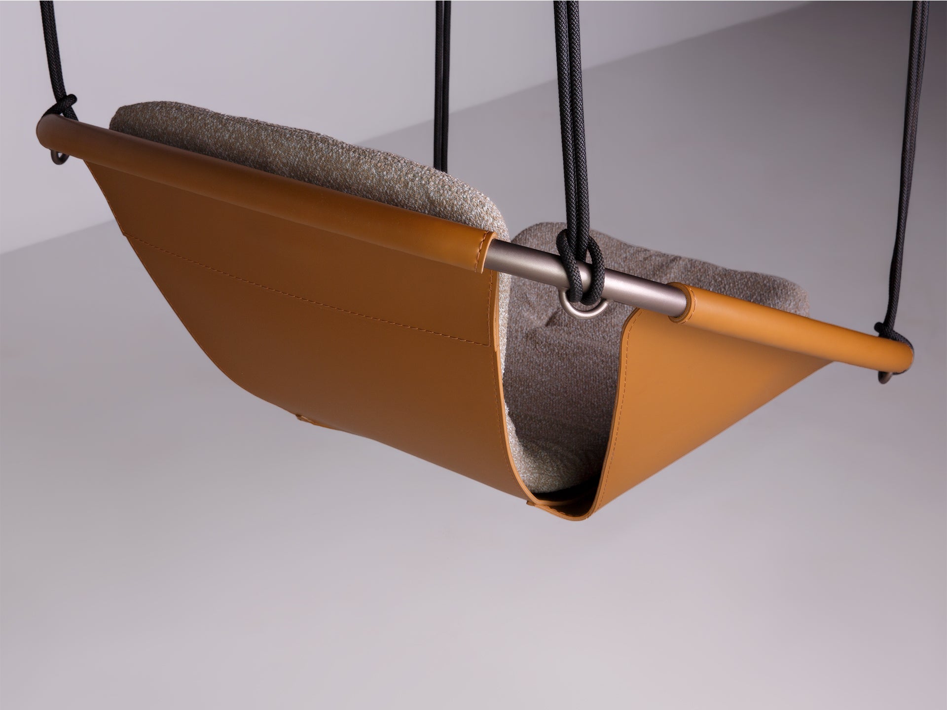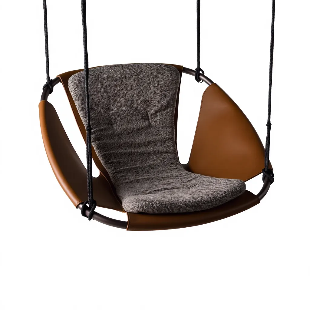 Balanço em metal e soleta natural e assento estofado.