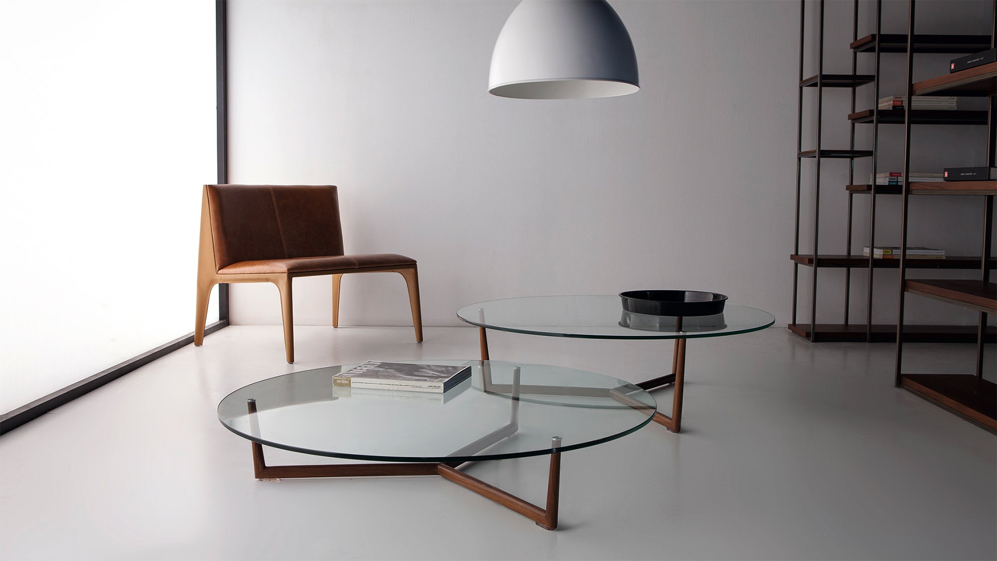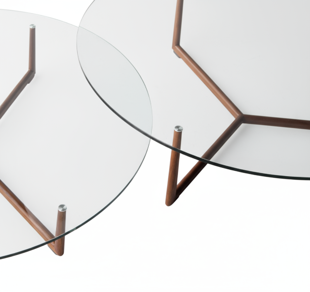 Mesa de centro em metal com tampo em madeira ou vidro.
