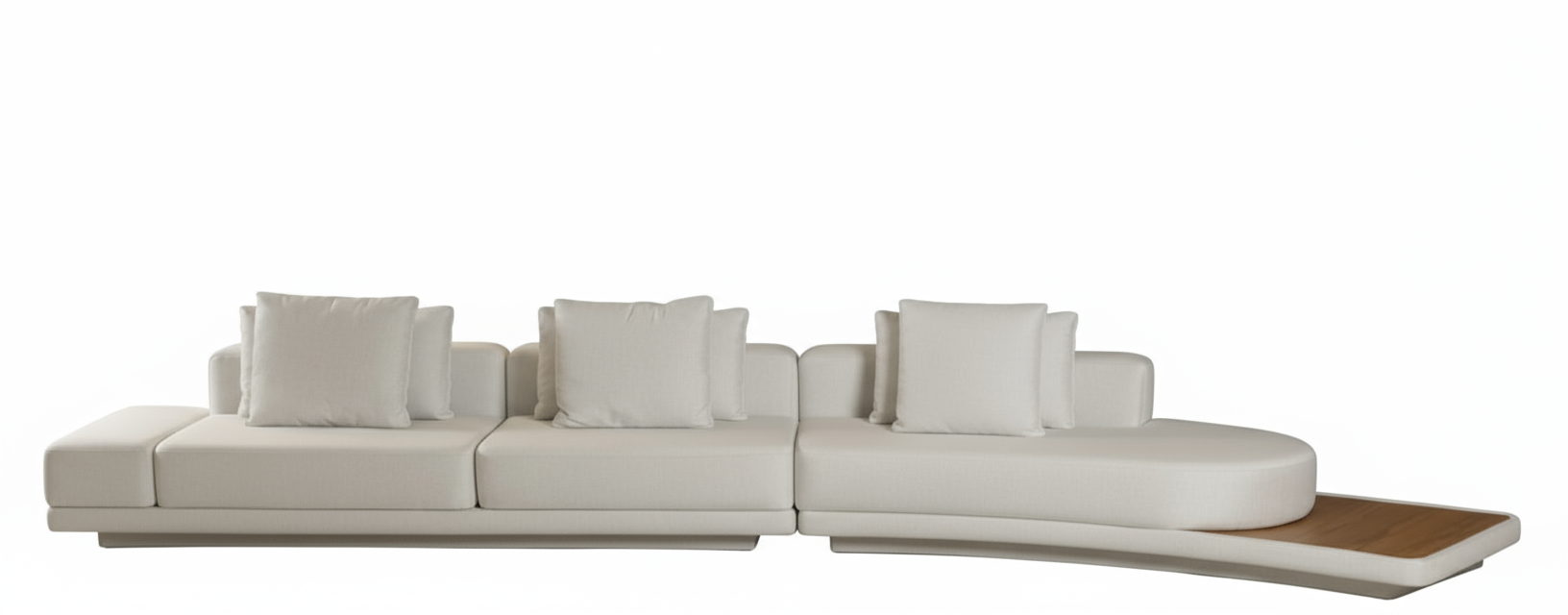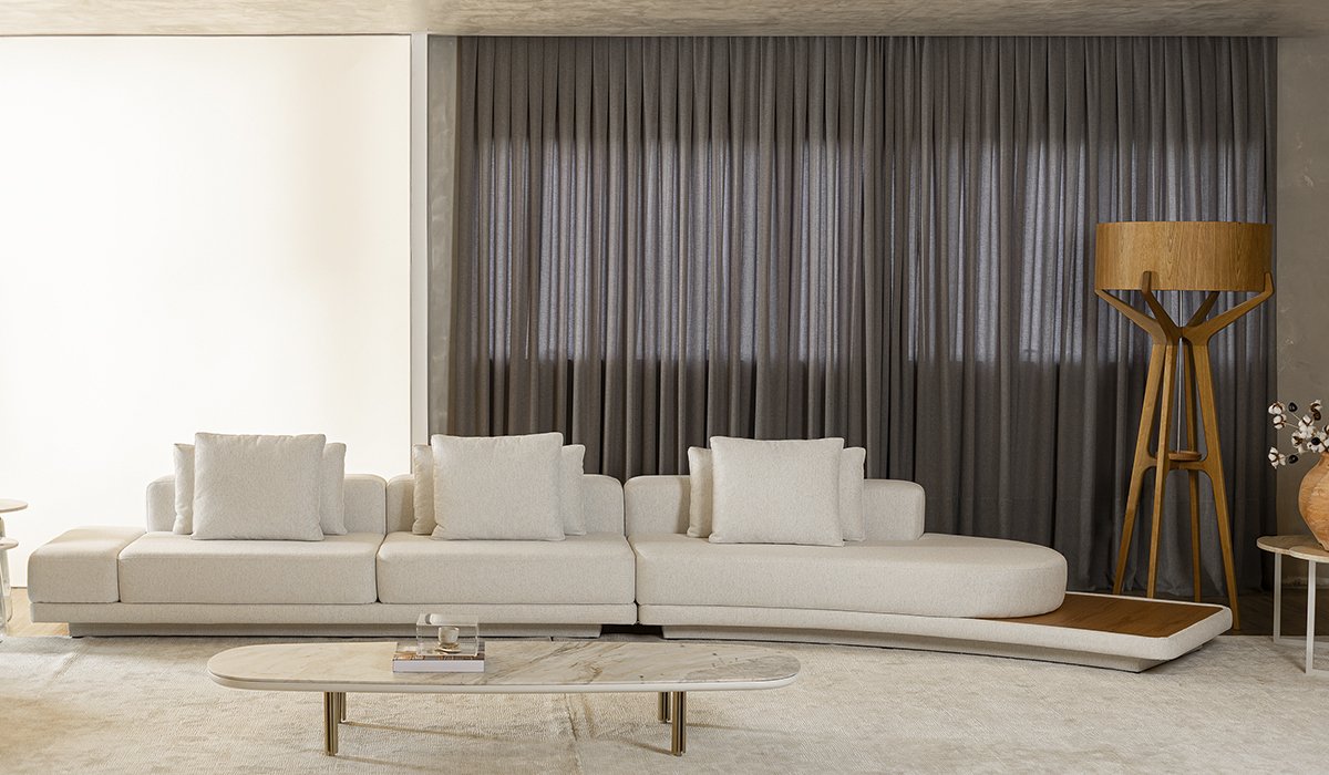 O modelo Full tem uma variedade enorme de modulações, módulos com traços retos e angulares, são diversas as combinações que o modelo proporciona, os pés recuados revestidos em tecido, criam uma sensação de flutuar. O modelo dispõe de mesas em acabamento laminado.