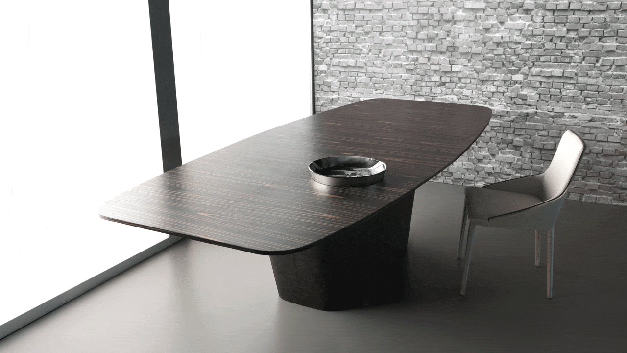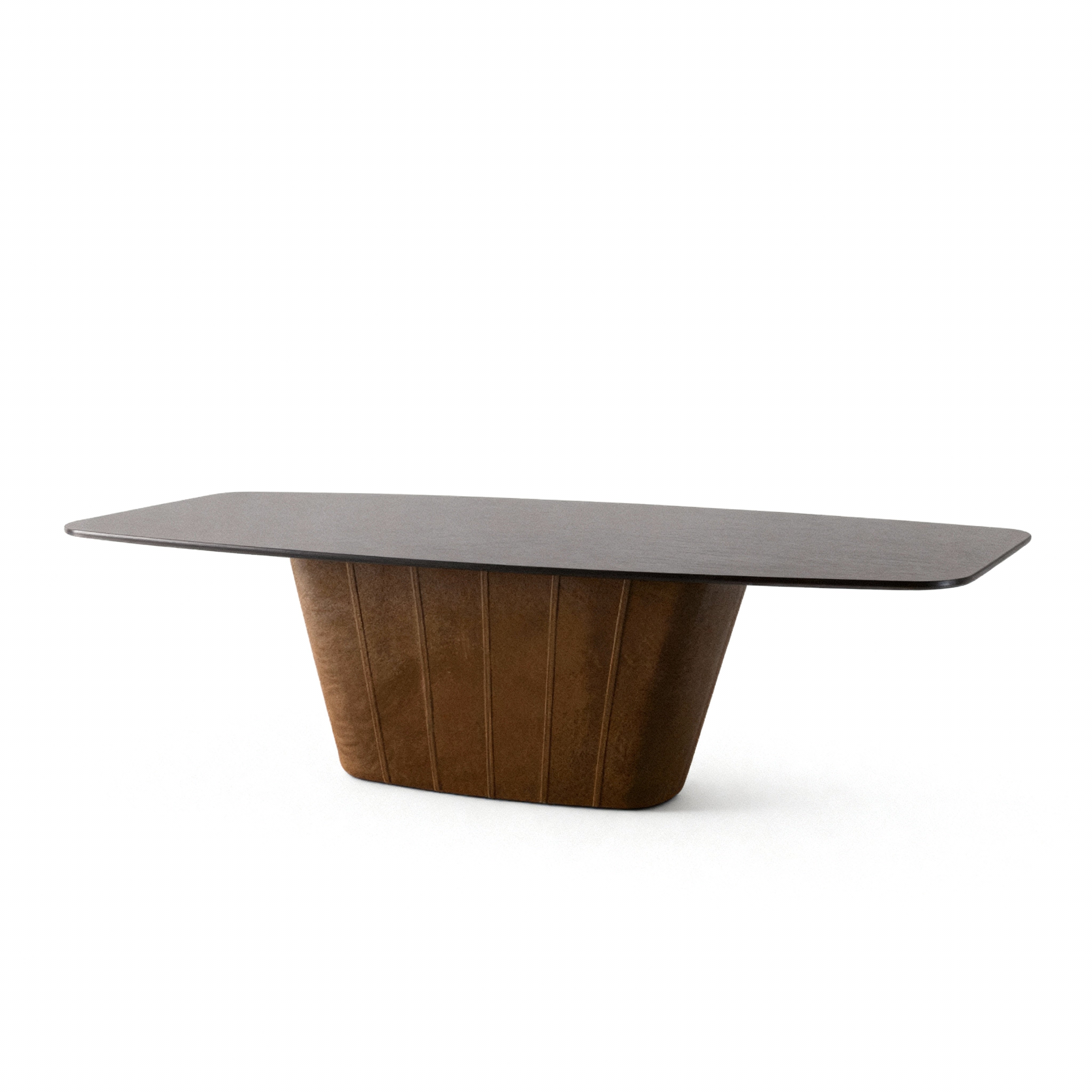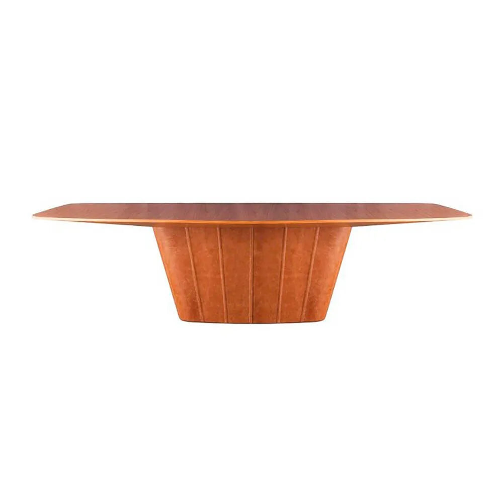 Mesa de jantar em madeira e couro.