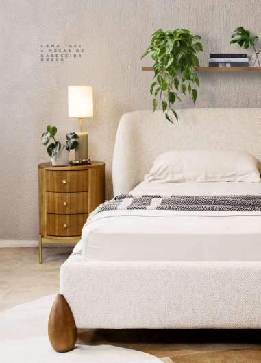 Cama TessAltura do chão até o colchão: 22cmMadeira disponível: eucaliptoAcabamento na foto: nogueiraAcabamentos disponíveis: