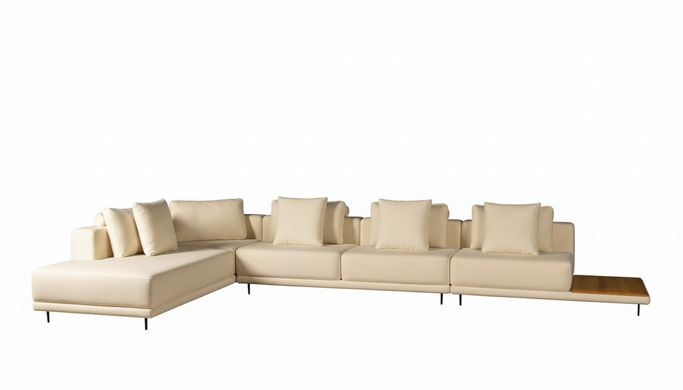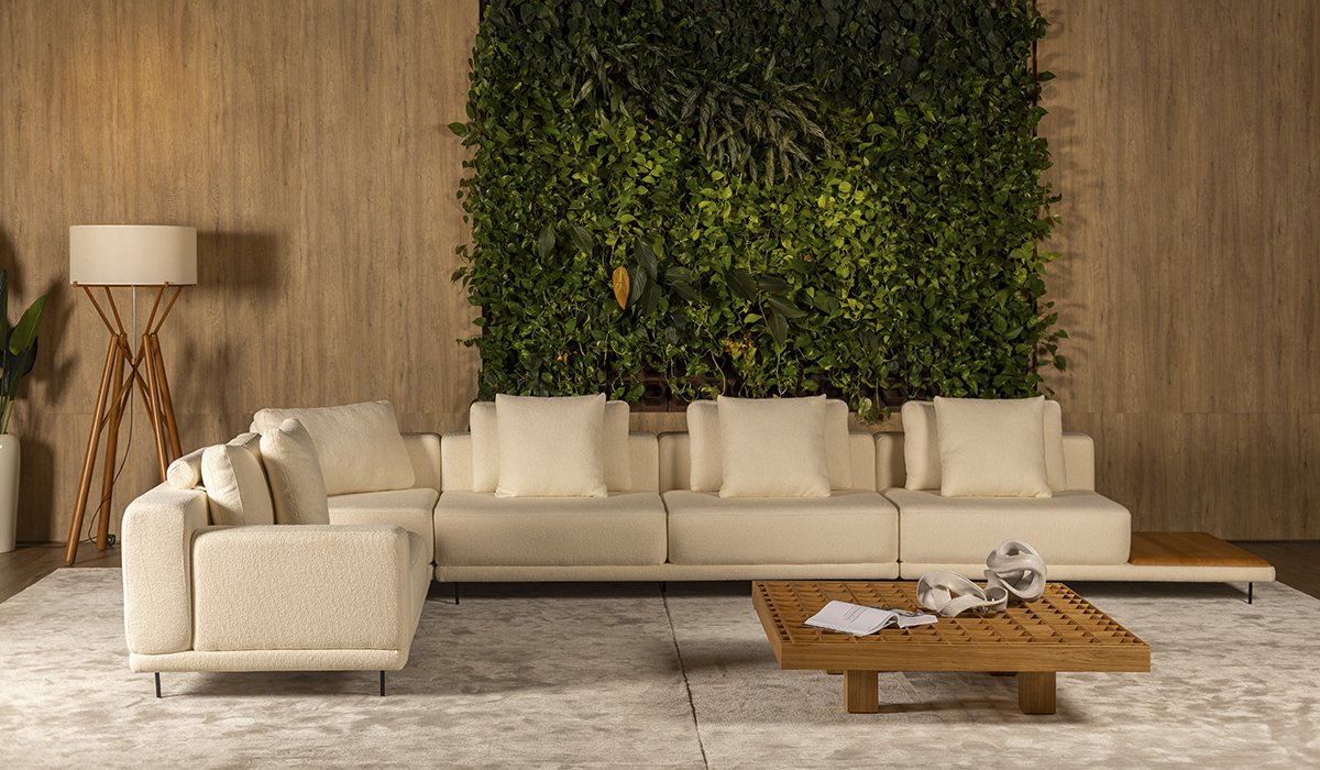 Seguindo a linha de traços tradicionais, o sofá Versa tem uma grande variação de módulos, criando diversas composições, a mesa em madeira de tauari é um detalhe que cria personalidade e sofisticação.